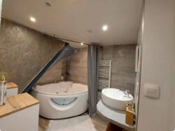 - Salle de bains indépendante avec ballon d'eau chaude très « design », sèche-serviettes radiateur paramétrable, grand bac à douche, évier et son meuble bas ainsi qu'un miroir, WC, etc.