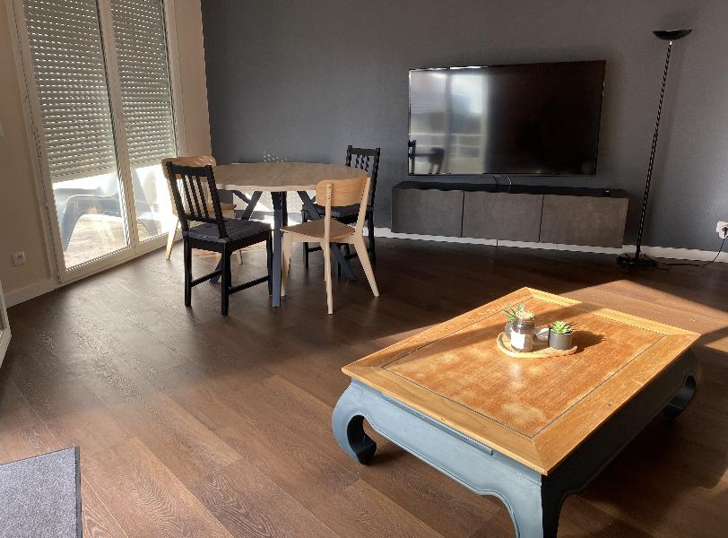 Au 1er étage d'un immeuble pierre, T2 de 56,37 m² composé d'une entrée, séjour, cuisine indépendant aménagée et équipée, chambre, salle de bains, wc avec espace buanderie