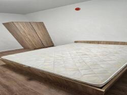 lit double avec sommier bois clair, matelas récent, grande armoire assortie. rideaux en dentelle blanche. possibilité d'installer un bureau sans souci, y'a l'espace.