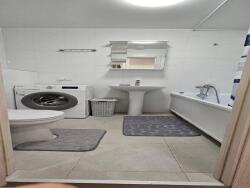 propre, avec baignoire, vasque, miroir, machine à laver neuve, wc et carrelage clair.