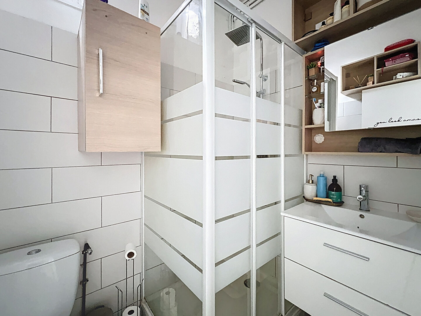 L'espace nuit comprend une chambre confortable d'environ 13 m², une salle de bain avec WC, ainsi qu'un dégagement avec rangement optimisant la circulation et les volumes.
