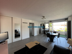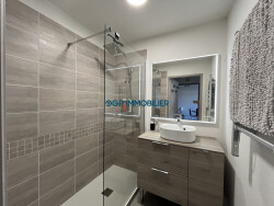 - Cuisine aménagée et équipée (plaque, frigidaire, hotte) - Clim réversible - Huisseries PVC avec volets roulants