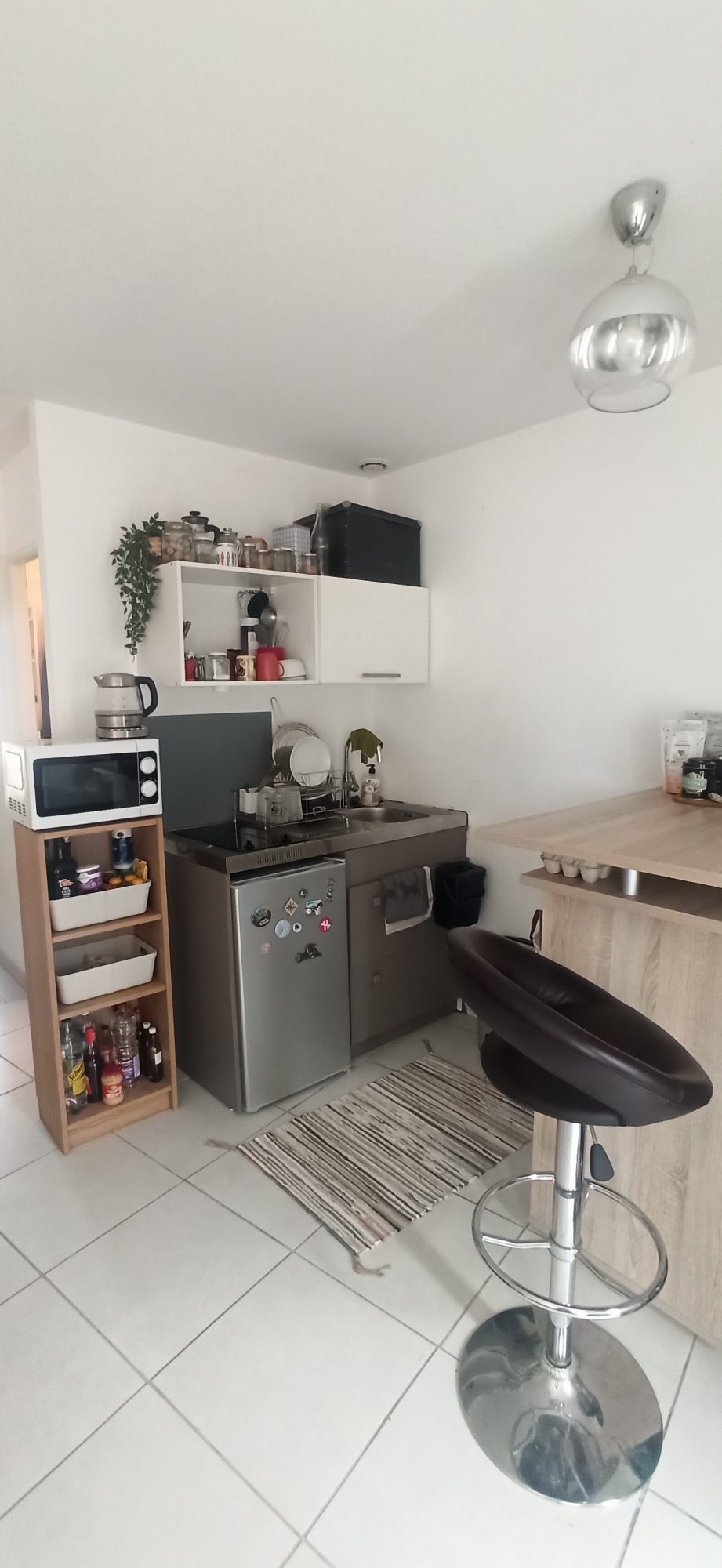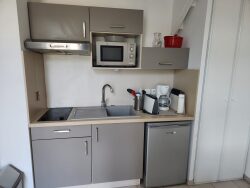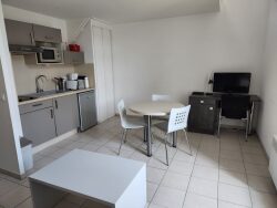 Dans une résidence sécurisée avec petit jardin commun et une laverie commune, au 1er étage du bâtiment D, un T2 duplex comprenant une entrée avec accès séjour/cuisine, un escalier à gauche donnant sur une grande mezzanine lumineuse faisant office de chambre avec placard, et avec une longue salle d'eau avec WC.