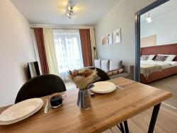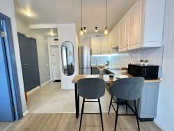 Le salon est cosy, avec un grand canapé gris clair, table basse, TV grand écran avec Netflix déjà installé, et un coin repas avec table et deux chaises hautes.