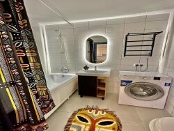 La salle de bain comprend une baignoire, machine à laver, miroir lumineux et rangements pratiques. Les WC sont séparés.