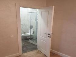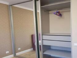 chambre separee, lit double, tete de lit tissu mauve, couette propre, grand placard miroir. sdb avec douche italienne, lave linge, meuble vasque, miroir lumineux, wc dedans.