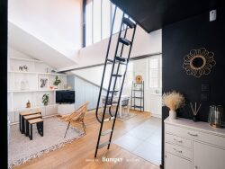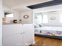 L'appartement se compose : - D'une grande pièce de vie exposée plein Sud et illuminée par de grandes baies vitrées ouverte sur la cuisine complètement équipée et aménagée avec du matériel haut de gamme, - D'une mezzanine permettant d'installer un coin bureau ou un couchage d'appoint, - D'une chambre avec dressing, - D'une salle d'eau, - Des WC séparés, Et d'une pièce buanderie avec sèche-linge et lave-linge.