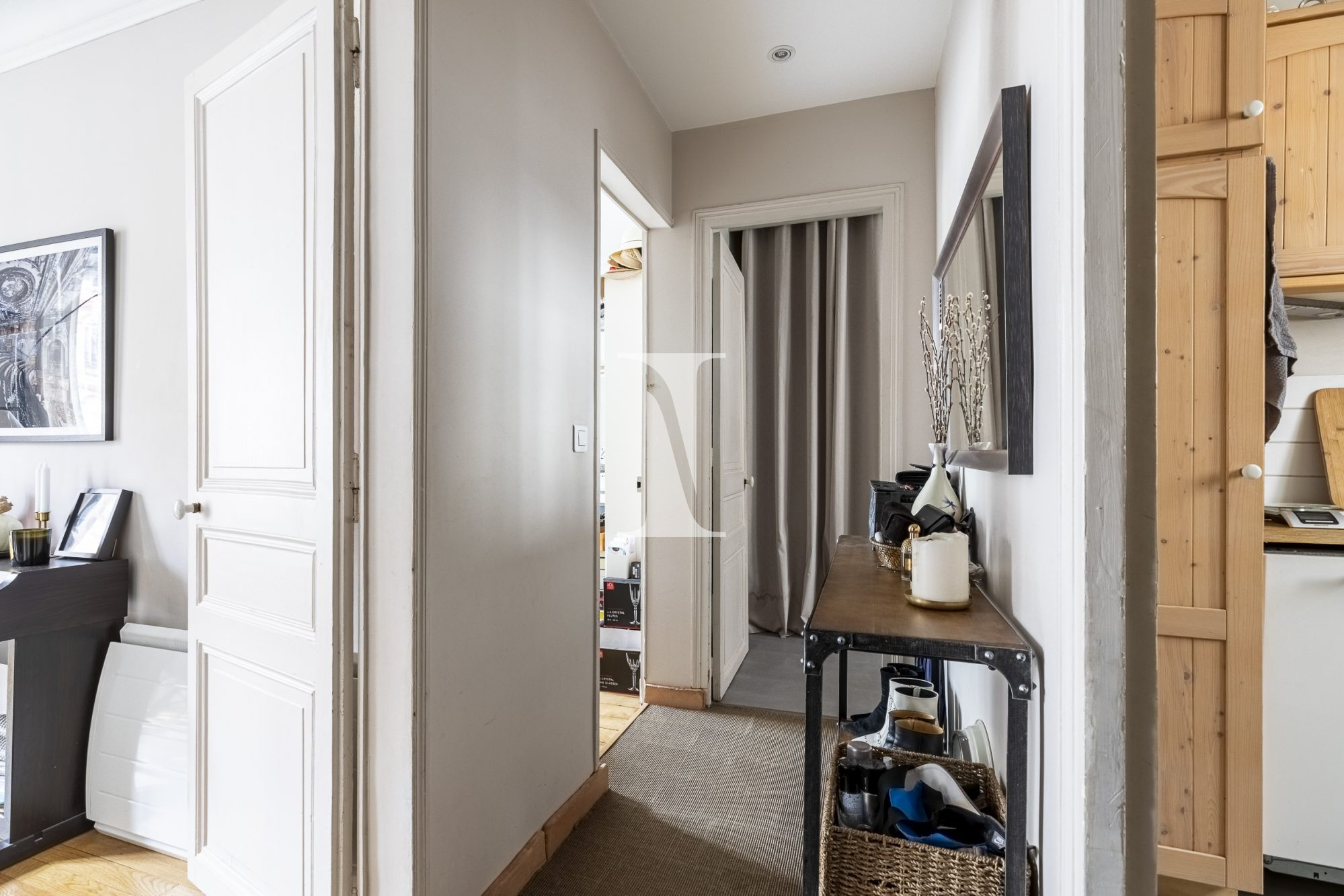 Il se compose d'une entrée, un séjour, une chambre, une salle d'eau avec WC, une cuisine dînatoire séparée. Appartement lumineux et calme, traversant sur rue (ouest) et cour (est), dont chaque pièce possède une fenêtre. Plan modulable et à optimiser. Moulures sur certains plafonds et portes. Idéal résidence principale et/ou investissement locatif.