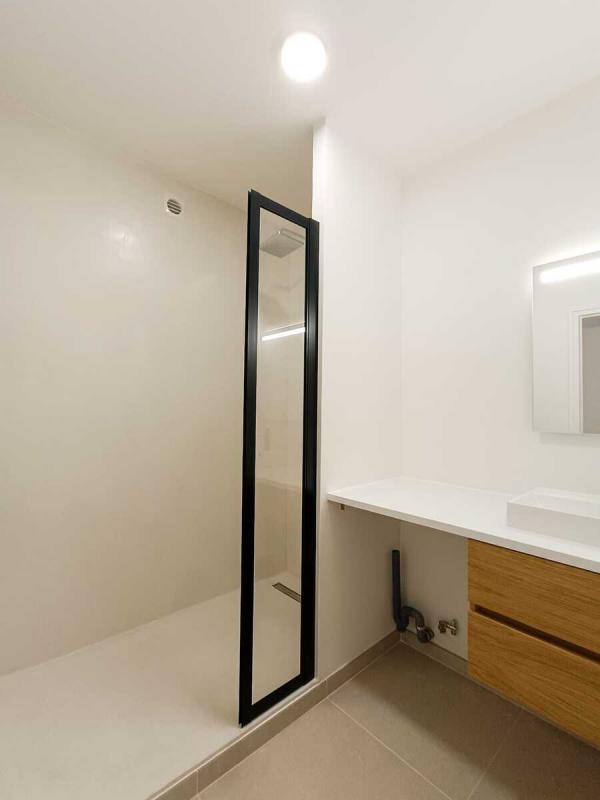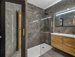 Grande salle de bain équipée (meuble vasque, miroir, sèche-serviettes)