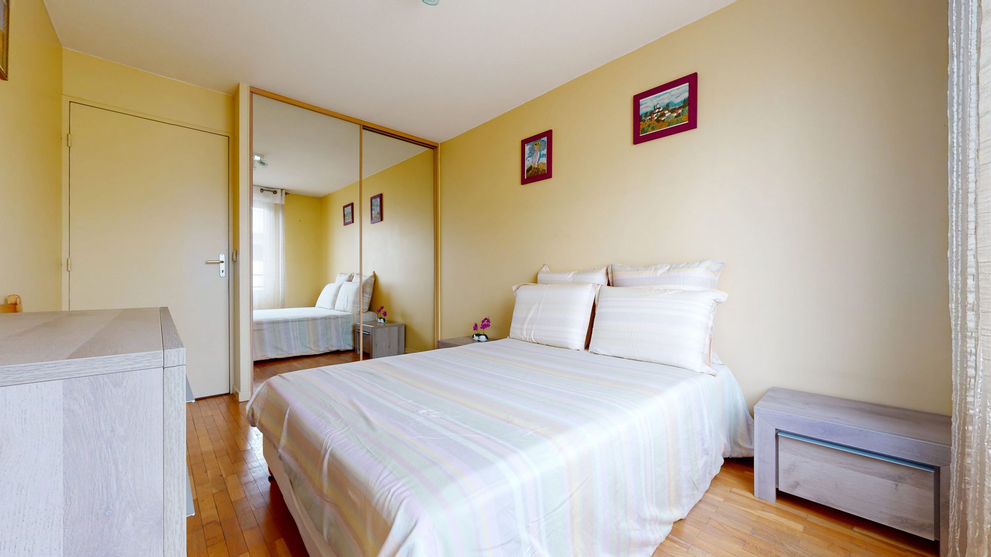 À l'étage, l'espace nuit comprend deux chambres dont une avec un grand dressing à aménager de penderies selon vos envies, ainsi qu'une salle d'eau complète équipée d'une douche à l'italienne, baignoire et vasque avec miroir.