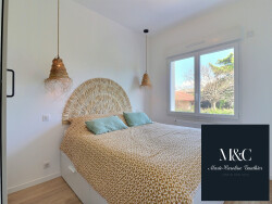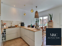 Au premier étage, l'appartement est composé d'une belle pièce de vie lumineuse avec cuisine ouverte, îlot central pour des repas conviviaux, deux chambres et salle d'eau.
