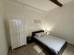 L'appartement se compose d'un séjour lumineux, avec belle hauteur sous plafond et poutres apparentes, d'un coin cuisine aménagé, d'une salle d'eau avec WC, et de deux chambres : une principale confortable et une seconde de type alcôve ou bureau/chambre d'appoint.