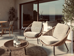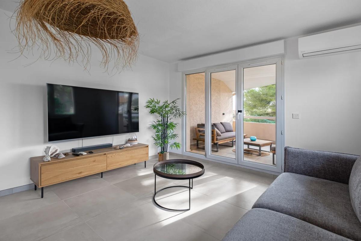 Salon séjour, permettant de le meubler très correctement, puisqu il offre une belle surface de parois aveugles , une baie coulissante en aluminium double vitrage ouvrant sur la terrasse, une cuisine indépendante communiquant avec la terrasse et équipée d une cuisine MOBALPA avec électroménager de marque, réfrigérateur congélateur, machine à laver le linge intégrée, lave vaisselle, plaque , four et micro onde , évier inox. Un hall d entrée desservant le couloir qui distribue les deux chambres de 11 et 12 m2 équipées de placard dressing.Une salle d eau moderne et un WC indépendant. L appartement est équipé d un climatisation réversible , de volets roulants électrique partout, il est sans travaux la cuisine a très peu servie.