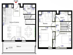 Au 1er niveau : une entrée, un WC avec lave mains et un séjour avec espace cuisine aménagée ouvrant sur un balcon de 13m².