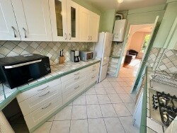 La cuisine, séparée et entièrement équipée, dispose de meubles de rangement haut et bas, d'une hotte, d'une plaque de cuisson au gaz de ville, d'un four, d'un micro-ondes, d'un réfrigérateur et d'un congélateur, elle est prolongée par une loggia équipée d'un lave-linge.