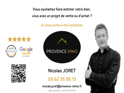 Pour plus d'informations ou pour organiser une visite, je vous invite à me contacter : Nicolas JORET, agent commercial Provence-Immo (immatriculé sous le numéro 904 944 618) - 06 62 35 85 13 Cette annonce vous est proposée par Joret Nicolas - - NoRSAC: 904 944 618, Enregistré au Greffe du tribunal de commerce de Salon de Provence