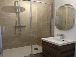 Salle d'eau rénovée avec douche, lavabo et WC