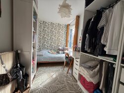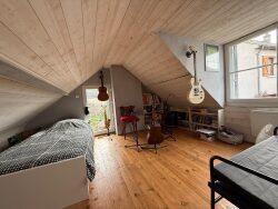 À l'étage, une grande chambre, actuellement divisée en deux espaces, offre de belles possibilités d'aménagement pour en faire deux comme il y à actuellement. À l'extérieur, vous profiterez d'un agréable jardin ainsi que d'un grand garage de 18 m².