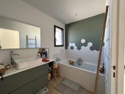 EXCLUSIVITÉ TRÉMÉLOIR-PORDIC, Belle Maison Contemporaine de PLAIN-PIED de 5 pièces sur 675 m² de terrain paysager, comprenant : Hall d'entrée avec penderie, belle pièce de vie avec cuisine équipée à l'américaine ouvrant sur terrasse et jardin sud-ouest, suite parentale ouvrant sur terrasse avec dressing aménagé et salle d'eau privative, 2 chambres, salle de bains et WC. Buanderie et patio.Garage.DPE EN COURS. Chauffage au sol par Aérothermie. REF 4249CLAIRE ET ENSOLEILLÉE.. COUP DE COEUR ASSURÉ..Honoraires d'agence 5 % TTC à la charge de l'acquéreur.Prix hors honoraires 340 000 .