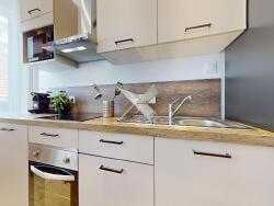 Un séjour lumineux avec cuisine équipée (plaques, four, réfrigérateur, vaisselle?)