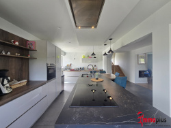 Au rez de chaussée : 1 entrée, 1 salon séjour attenant à une grande cuisine américaine entièrement équipée avec îlot central, avec accès terrasse et piscine, 1 salle d'eau avec douche à l'italienne, double vasque et WC
