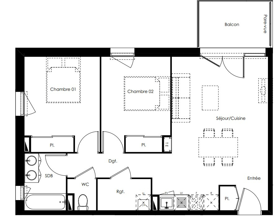 Type 3 avec 2 chambres et parking individuel extérieur.