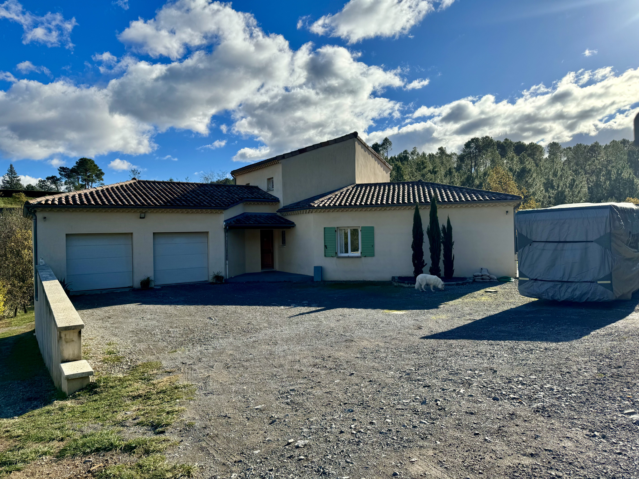 La Bâtisse propose plus de 182 m2 habitables, élevés sur Caves Voutées avec 2 Superbes Terrasses de part et d'autre de la maison proposant une magnifique Vue sur les Montagnes environnantes coté Nord-Estet sur la Piscine en contrebas et le Jardin Paysagé coté Sud-Ouest.