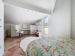 L'étage est composé de deux grandes chambres avec rangements, d'une salle de bain avec balnéothérapie et d'un grenier aménageable. Chaque chambre dispose de sa terrasse privative avec vue sur la piscine. La maison bénéficie d'un grand ensoleillement toute la journée et offre de belles perspectives paysagées sur le jardin et la piscine bordée de terrasses en bois exotique.