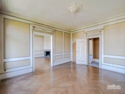 C'est au 3ème étage sans ascenseur, donc, que nous franchissons le palier de l'appartement « Belvédère » et découvrons dès l'entrée l'agencement de cet appartement familial et bourgeois. Grâce à un couloir de distribution servant chaque pièce de l'appartement, vous serez immédiatement attirés par ses trois pièces de réception sur l'avant, respectivement de 27 m² Carrez, de 28 m² Carrez et de 26 m² Carrez, baignées de soleil et offrant une vue spectaculaire en direction de l'Orangerie et de la Cathédrale. Si des travaux d'embellissement seront nécessaires pour lui redonner son lustre d'antan, vous serez conquis par les hauteurs sous plafonds et les moulures de « Belvédère » tout comme par ses parquets à bâtons rompus plus que centenaires et ses balcons.