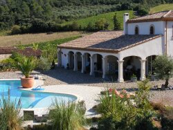 Une hacienda avec une situation privilégiée dans le midi et avec des vues dominantes ! Savourez toutes les qualités d'une vie en liberté entourée de vignes, de la nature et des vues lointaines ! Superbe localisation pour cette propriété de qualité, au milieu d'un paysage vallonné avec des vues imprenables. Elle se situe en lisière d'un petit hameau pittoresque où le temps semble s'être arrêté. Le centre de St. Chinian se situe à seulement quelques kilomètres et on y trouve un large éventail de commerces, terrasses, restaurants et autres commodités. La région offre une grande quantité de sorties et excursions. A partir de la propriété on peut se promener ou faire du vélo ou encore du VTT, en toute quiétude, durant des heures. Les villes de Béziers et Montpellier (chacune dotées de leurs propre gare TGV et aéroport international), se situent à environ 30 et 70 minutes et les plages Méditerranéennes à environ 40 minutes de voiture. La ville Romaine de Narbonne se situe à environ 30 kilomètres. La villa a été construite, sous architecture et sur vide sanitaire, dans les années 2003/2004 d'une manière régionale et dans un style Méditerranéen d'Hacienda, autour d'une cour intérieur . Elle se caractérise par des pièces spacieuses. Il s'agit d'une maison ou l'on ressent immédiatement comme un air de vacances, même si on peut y vivre parfaitement durant toute l'année. La propriété offre une surface hors uvres brut de = 580 m² y compris la surface habitable de plus de 225 m². La villa est presque entièrement de plain-pied et offre entre autres un séjour-salon de type "open space" ( 97 m² ! ) avec une belle hauteur avec une charpente apparente, une cheminée et plusieurs portes vers les terrasses et le patio, 5 chambres, 3 salles d'eau, 1 salle de bains et un bureau. En outre, cette propriété unique offre un vaste garage, une cuisine d'été avec cheminée, un patio, plusieurs terrasses couvertes, une chaufferie et un local technique et des plages pour la piscine. La maison a été construite d'une manière durable . Par exemple, les cloisons ont été prolongées dans les plafonds, pour une meilleure isolation phonique, et un chauffage par le sol a été prévu sur le rez de chaussée, qu'il n'a d'ailleurs jamais été nécessaire de raccorder. Les murs intérieurs ont une isolation supplémentaire en béton cellulaire et les nombreuses terrasses couvertes sont dotées d'une isolation au plafond pour conserver la fraîcheur pendant les jours les plus chauds de l'année. Bien évidemment la propriété est équipée d'un éclairage de jardin et un système d'alarme avec plusieurs caméras. La propriété est habitable de suite mais nécessite quelques travaux de finition. Ceci a été pris en compte dans le prix. L'Architecte a souhaité obtenir un ensemble harmonieux avec dans chaque pièce une dose agréable de lumière et une vue sur le patio ou la nature environnante. Aujourd'hui on peut constater qu'il a parfaitement réussi ! L'accès à la parcelle (11 350 m²), qui semble se fondre avec la nature environnante, se fait par un chemin d'accès privé ou par une seconde entrée via le hameau voisin. Le jardin, qui nécessite relativement peu d'entretien, comprend un espace paysager autour de la maison avec une végétation méditerranéenne mature comprenant des lauriers roses, des herbes ornementales, des oliviers et des pins. La partie inférieure du jardin abrite une oliveraie en cours de création et a été volontairement gardée en état sauvage-contrôlée et offre entre autres une grande variété d'herbes aromatiques. Dans le jardin on ressent immédiatement un sentiment de détente et de savoir vivre, à la hauteur de la renommée mondiale de cette région (Top 5 dans le classement de CNBC !). L'ensemble est complété par la piscine filtrée au sel. Cette vaste piscine ( environ 15m x8m ! ) en forme libre est fabriqué en béton projeté avec plage immergée et finie avec un système de revêtement et de filtration de la prestigieuse marque Diffazur. Le système à débordement accentue la vue magnifique sur les vignes et le paysage méditerranéen vallonné. Une propriété de conception unique dont on peut profiter durant les 4 saisons d'une manière optimale du climat Méditerranéen. Les vues riches, variées et lointaines rendent cette propriété parfaite et une bonne opportunité d'investissement. Offre exclusive. Visites sur rendez-vous.