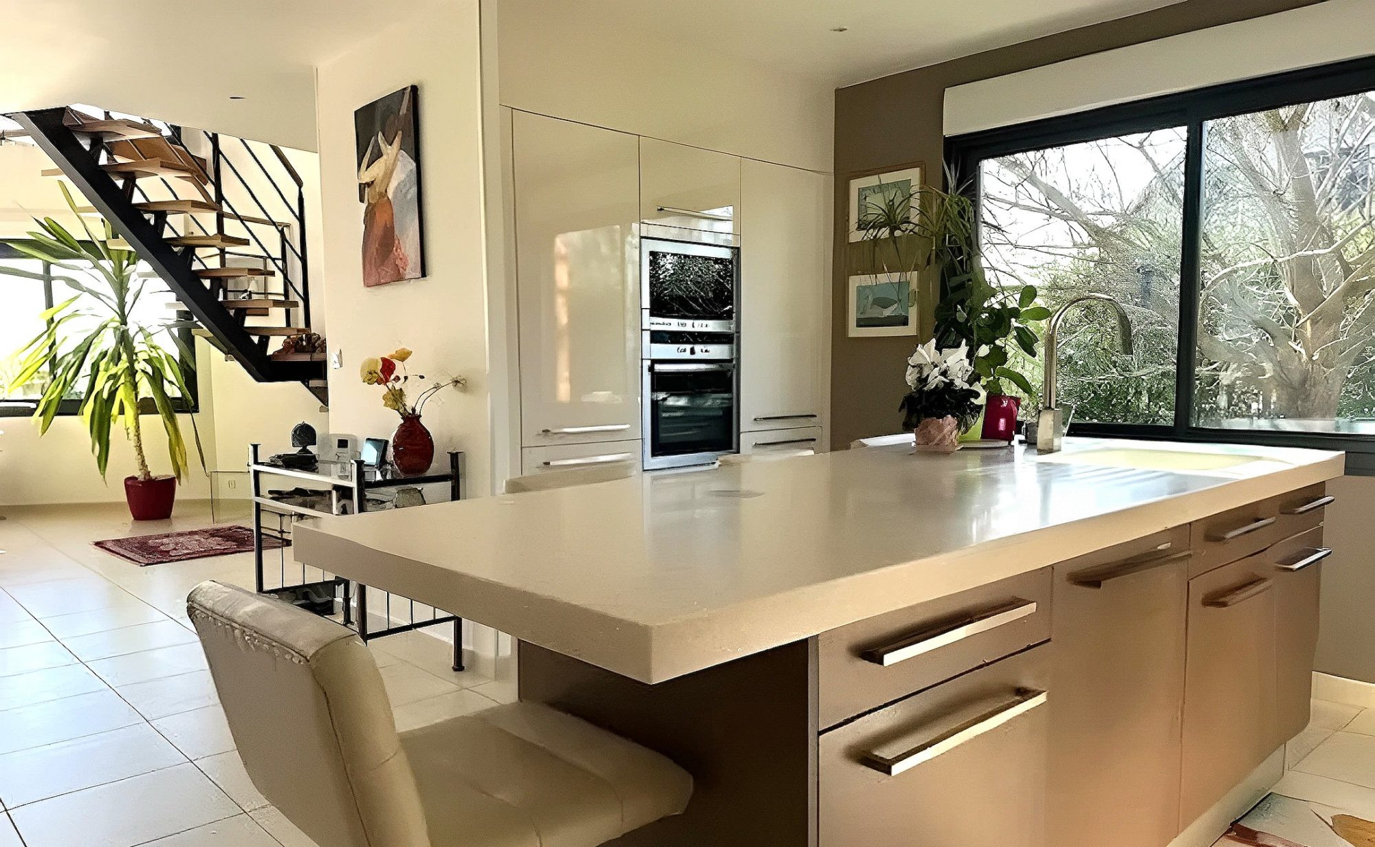 La cuisine haut de gamme aménagée et entièrement équipée s'intègre harmonieusement à la pièce de vie et offre un espace à la fois design et fonctionnel.