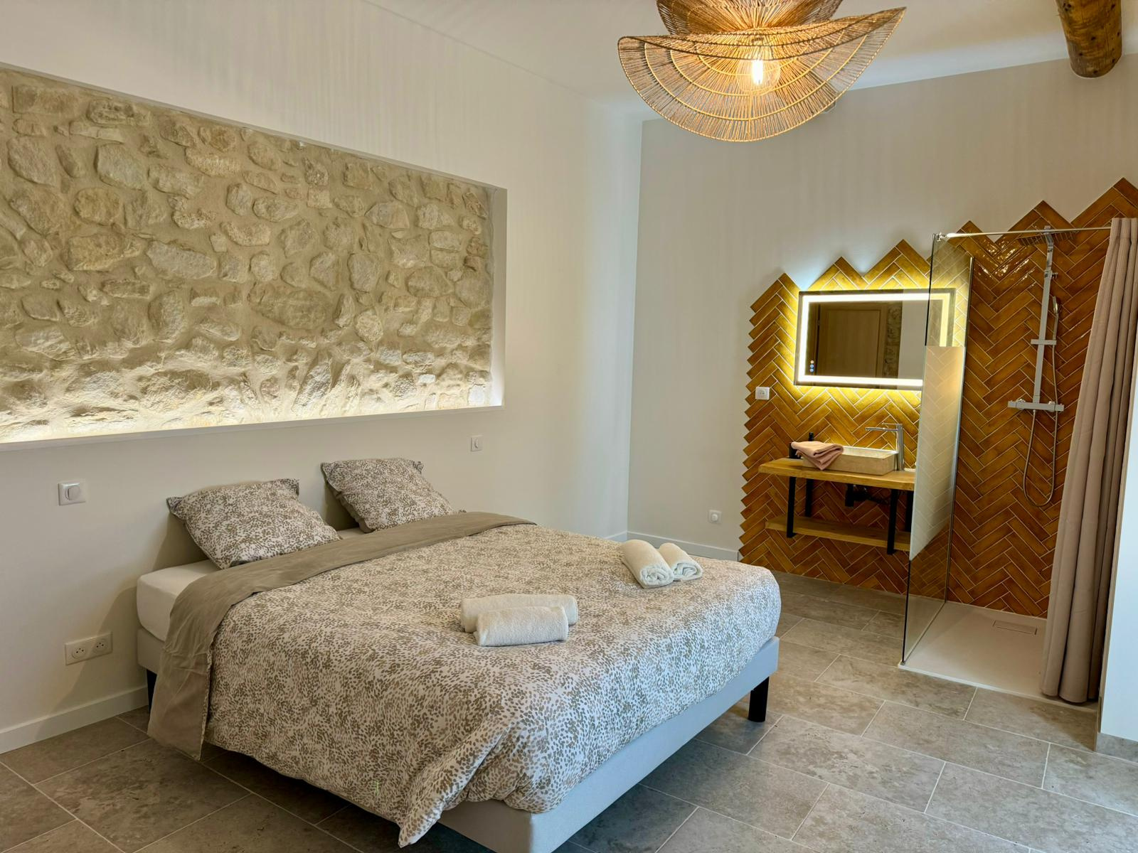 Entre les collines de Pernes-les-Fontaines et le village des antiquaires de l'Isle-sur-la-Sorgue, il est une propriété rare et hors du commun et surtout incomparable. Unique et située idéalement entre Ventoux et Luberon elle allie douceur du charme provençal et prestations contemporaines de haute voltige. Restaurée intégralement en 2024 elle fait rimer l'excellence à l'élégance. Un domaine de 800 m2 environ au coeur d'un parc arboré de chênes truffiers, de pins et d'oliviers de 15 hectares entièrement clos pensé dans les moindres détails pour offrir un cadre de vie luxueux et serein. Une belle allée bordée de cyprès nous emmène jusqu'à la propriété. Dès l'entrée on est saisi par l'atmosphère raffinée qui règne dans les lieux. Un vaste hall spacieux baigné d'une lumière traversante ouvre d'une part vers la cuisine. Cuisine design équipée entièrement en professionnel. Chaque plan de travail est ' 100% minéral ' mélange de verre, porcelaine et quartz ainsi que la table en prolongement pour prendre ses repas. Une cuisine imaginée par des épicuriens qui conjuque des matériaux nobles, un électroménager haut de gamme encastré, des lignes graphiques et une touche de couleur vitaminée. Un espace aussi fonctionnel qu'esthétique. Elle ouvre directement sur la salle à manger de 60 m2 côté parc. Mariage chic et intemporel mêlant le bois, le métal, l'aluminium et le parefeuille, cette pièce maîtresse dans la demeure est un espace de réception idéal et convivial. D'autre part, un salon principal marie avec subtilité les poutres apparentes en bois massif, une cheminée ancienne en pierre et une décoration contemporaine soignée. Le mobilier aux lignes épurées s'intègre parfaitement dans cet univers feutré. Une seconde pièce de vie, plus intime, pensée comme un home cinéma, propose une ambiance chaleureuse grâce à un mobilier capitonné et une installation audiovisuelle de grande qualité. La suite parentale en rez de jardin incarne l'élégance de la propriété. Toute en teintes naturelles elle offre un confort absolu dans une ambiance douce. Une porte s'ouvre directement vers la salle de bains en marbre texturé avec une baignoire et une douche à l'italienne dotée d'une vaste assise intégrée. Trois autres suites dont une double avec chacune sa salle d'eau ou de bains et ses toilettes et son dressing. Un vaste bureau. Une salle de sport avec douche et toilettes de 45 m2. Un espace extérieur avec une cuisine d'été totalement aménagée et une salle à manger ouverte et ombragée qui donne accès à une jolie tour en pierre typique pour recevoir vos amis grâce à ses deux jolies chambres avec salle d'eau et toilettes. On peut ainsi profiter de la piscine en pierres de Bali avec plage immergée et pointe de diamant. Un appartement indépendant de 60 m2 . Vendue entièrement meublée avec un mobilier de 'designer'. Des prestations de qualité: une maison domotisée avec chauffage au sol, climatisation gainable réversible, menuiseries en aluminium Schüco, portes en bois exotique, volets roulants électriques avec des volets bois conservés pour l'esthétique, eau de ville filtrée, eau du canal pour l'arrosage extérieur, puits. Plomberie et electricité neuves. Un double garage de 130 m2 pour 6 voitures. Un carport. Deux portails, deux accès indépendants. Une grange de 170 m2. Une bergerie de 180 m2 à restaurer. 'Une incroyable découverte nichée entre deux beaux villages de Provence. Incomparable dans ce secteur prisé en campagne et proche de toutes les commdités'.