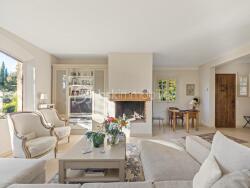 - Au rez-de-chaussée : Un salon lumineux d'environ 60 m² avec cheminée, un coin bureau et un espace salle à manger, une cuisine séparée équipée, deux chambres, une salle de bains et un WC invité. Ces pièces s'ouvrent sur une vaste terrasse abritée avec vue sur la piscine.
