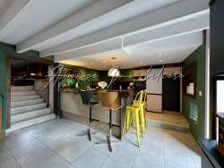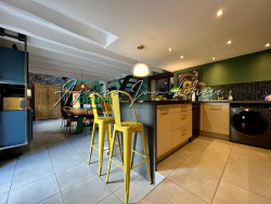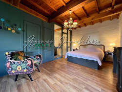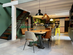 - Au rez-de-chaussée : Généreuse salle à manger avec cuisine ouverte entièrement équipée, en enfilade le salon et son volume exceptionnel, plancher massif, grande mezzanine, accès jardin d'hiver (Verrières et tomettes). Une première chambre, dégagement, salle d'eau et wc indépendant.
