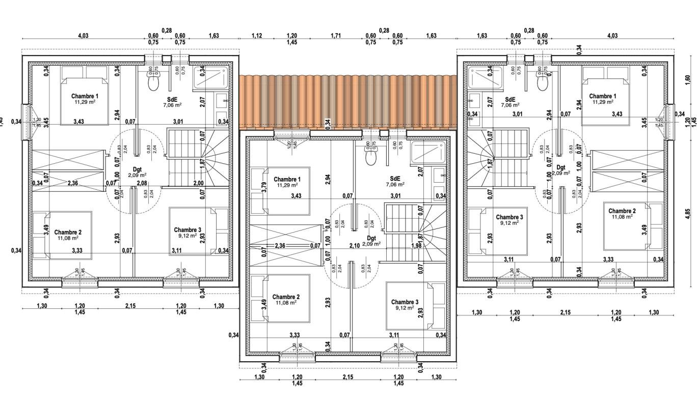 de trois chambres de 11 m²,