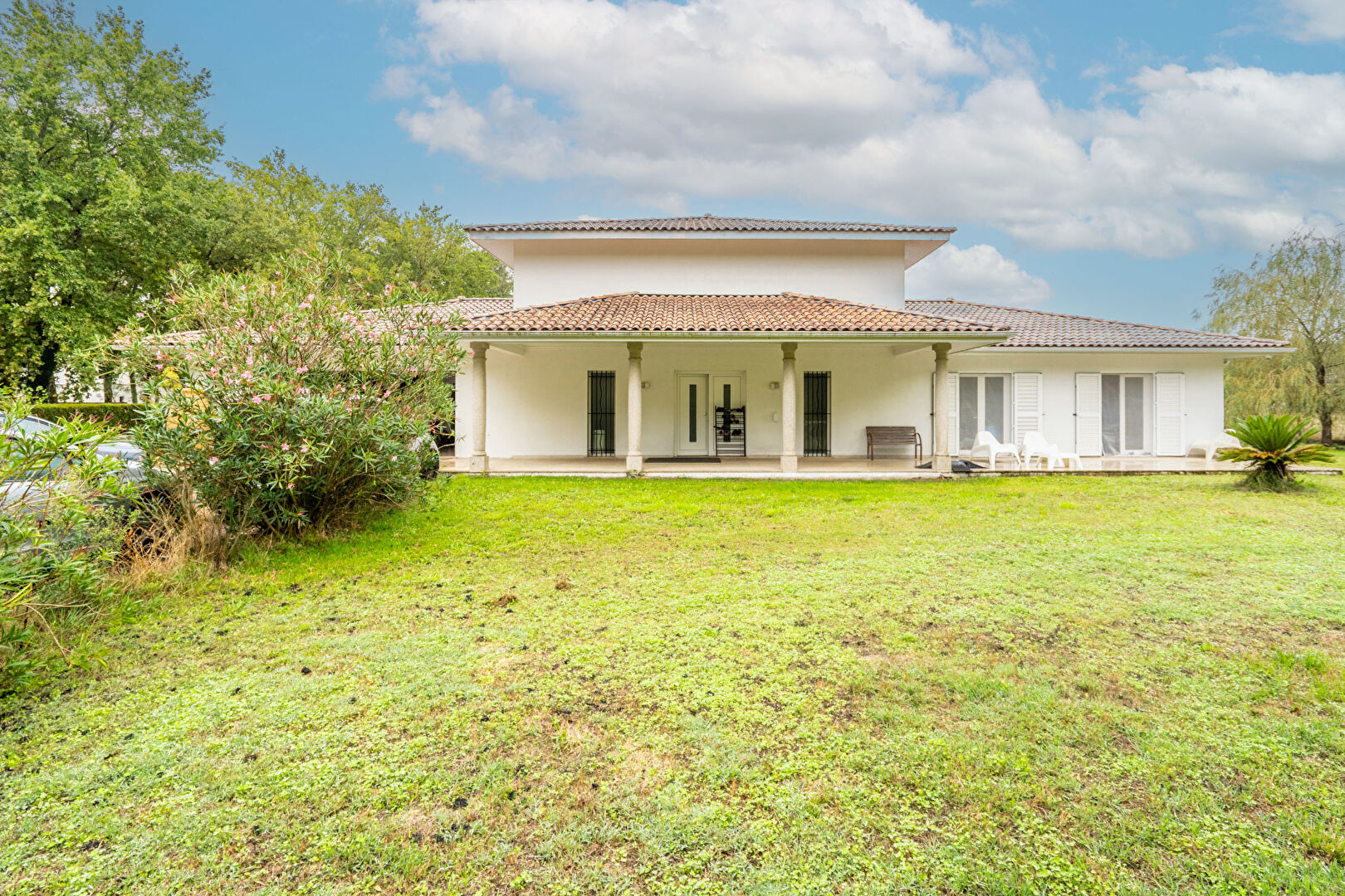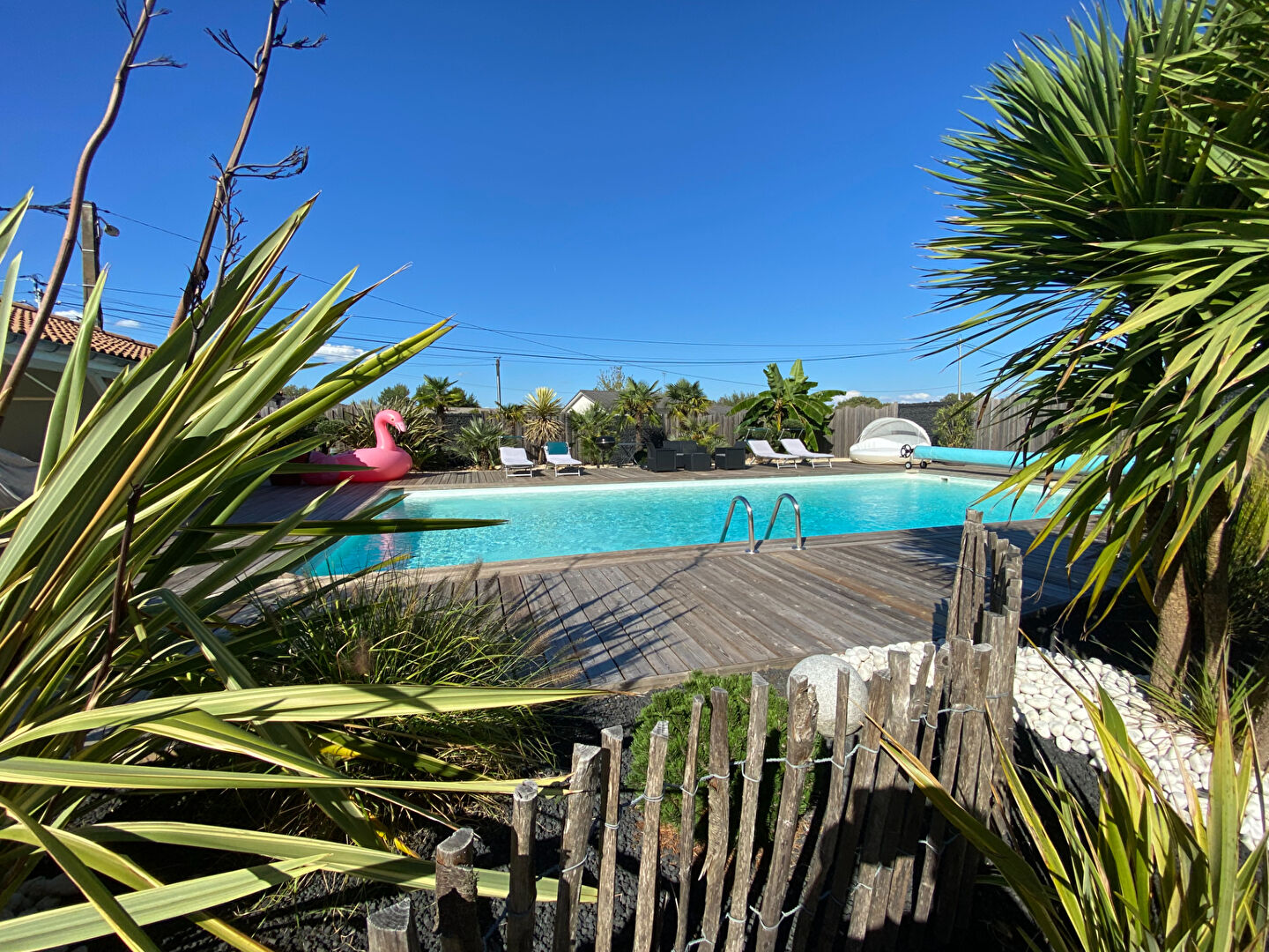 En extérieur, vous trouverez sur l'avant de la maison un jardin d'accueil arboré ainsi qu'une allée permettant le stationnements de plusieurs véhicules. Côté pièce de vie, la magie continuera d'opérer avec dans son prolongement un COULOIR DE NAGE (au sel, régulation de pH, volet roulant immergé) et sa VASTE TERRASSE où vous pourrez partager avec votre famille ou entre amis des moments conviviaux et chaleureux.