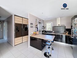 Dès l'entrée avec placard, vous serez séduits par une spacieuse pièce de vie lumineuse : sa cuisine américaine moderne s'ouvre sur le salon-séjour, créant un espace convivial et chaleureux. Cet espace se prolonge naturellement vers une superbe terrasse carrelée de 50 m² avec pergola, idéale pour vos repas d'été, vos soirées entre amis ou simplement pour savourer la quiétude des lieux.