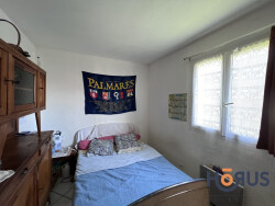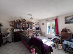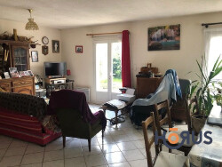 Maison de plain-pied comprenant une entrée ouvrant sur un séjour, une cuisine, un cellier, deux chambres, une salle d'eau et des toilettes séparées. Un garage est également disponible. L'ensemble est situé sur un terrain de 400 m2 et équipé de panneaux solaires.