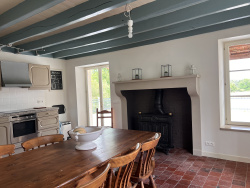 À votre arrivée, vous entrez dans la maison par un hall spacieux avec des toilettes séparées et un lavabo, un placard de rangement, un escalier menant à l'étage et une salle de bains avec baignoire, lavabo et raccordement pour la machine à laver. Sur la gauche se trouve le salon avec un insert à bois encastré et un chauffage au sol. À droite se trouve la grande cuisine à vivre avec un poêle à bois sous une belle cheminée, des plaques électriques, un four, un réfrigérateur avec congélateur encastré et un lave-vaisselle. Depuis la cuisine, des portes-fenêtres donnent accès à une grande terrasse extérieure carrelée avec véranda et une vue magnifique sur le paysage environnant. À l'étage supérieur se trouve un palier lumineux avec un chien assis, une salle d'eau avec douche, toilettes, lavabo et sèche-serviettes. À gauche, une chambre spacieuse avec des placards intégrés derrière le lit et des raccordements déjà prévus pour installer un lavabo. À droite, il y a deux autres chambres et, à côté, un placard où se trouve le chauffe-eau. À côté de la maison se trouve une grande grange divisée en plusieurs parties : un espace pour ranger le bois de chauffage, un espace de rangement supplémentaire, une grande partie centrale avec des grandes portes et, à droite, une grange avec mezzanine, celle-ci mène au garage, qui est également accessible depuis la route. Il y a aussi une cave sous la maison. Le terrain, d'une superficie totale de 1,23 hectare, se compose d'un pré adjacent à la maison et d'une partie boisée de l'autre côté du chemin. Toute la maison bénéficie d'une belle luminosité et le rez-de-chaussée est doté d'un authentique sol en tomettes en excellent état. Le toit de la maison est aussi en bon état. Le chauffage est assuré par du bois et des panneaux chauffants à économie d'énergie. Une maison joliment rénovée qui a conservé ses charmants détails français. Située sur une petite route de campagne tranquille, avec une seule maison voisine qui n'est pas habitée en permanence. Une maison idéale pour ceux qui recherchent un endroit prêt à emménager au coeur de la nature française, où le calme et l'authenticité sont au rendez-vous. Ref : 101795 Prix : 148.500 EUR HAI NoRSAC : 879 175 784 N'hésiter pas à nous contacter, langues parlées : Français , Anglais, Néerlandais et Allemand