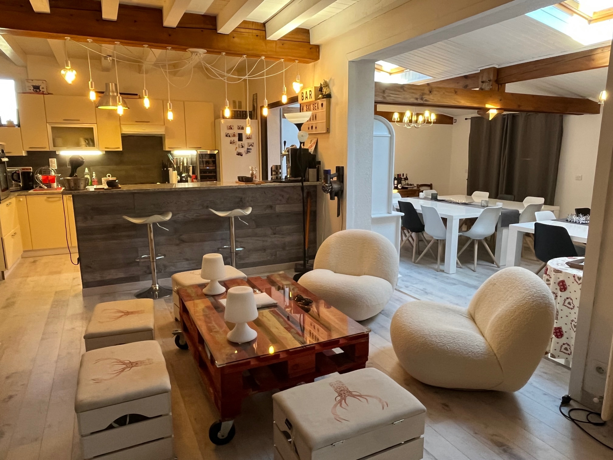 **Passons ensuite au gîte** Un lieu de vie conçu pour accueillir tous vos proches ou tout simplement pour un investissement locatif. Une pièce de vie chaleureuse agrémentée d'une cheminée, trois chambres avec salle de bain en font un bien idéal pour se retrouver en famille ou entre amis.