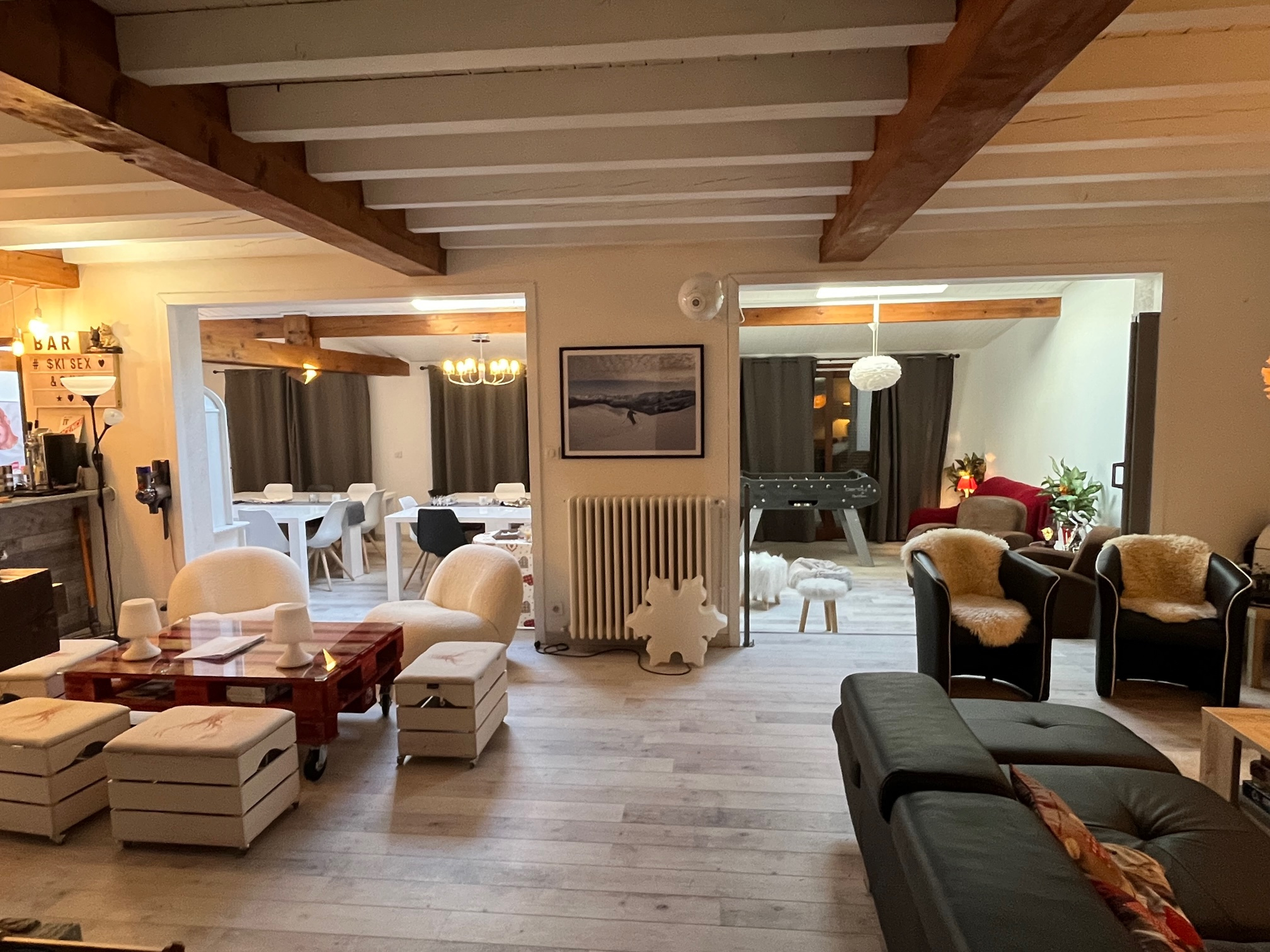 **Commençons tout d'abord par la demeure principale**. Sa magistrale pièce de vie, sa salle de billard, ainsi que sa cuisine nous plonge dans un univers à la fois cossu et authentique. Deux suites parentales, deux chambres et un immense dortoir desservis par des salles de bain, ainsi qu'un bureau viennent compléter ce tableau.