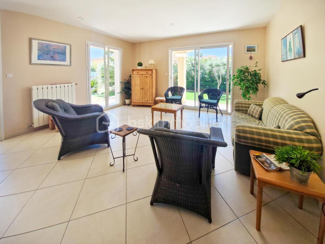 Une villa d'exception de 125 m2 sur un terrain de 300 m2, vous offrant une oasis de tranquillité à seulement 100 mètres de la plage. À votre arrivée, soyez accueilli par un espace de vie somptueux où le salon et la cuisine s'harmonisent pour créer une atmosphère chaleureuse et conviviale.