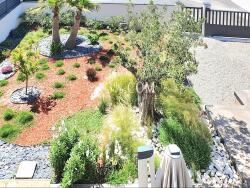 Jardin méditerranéen avec terrasse et jacuzzi.