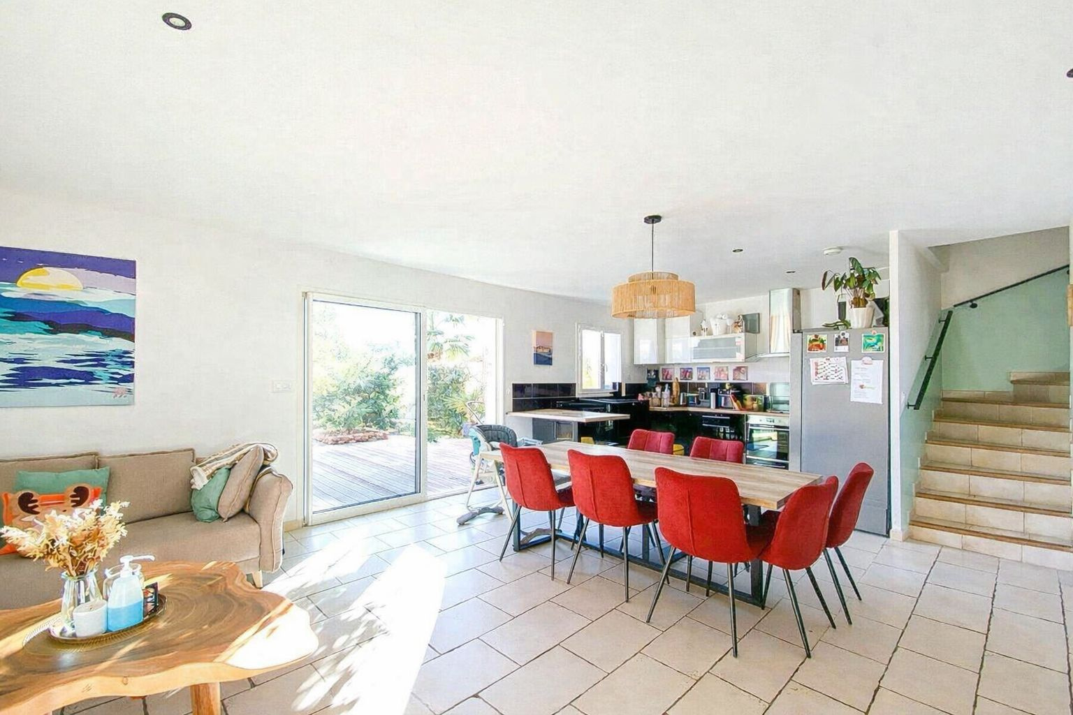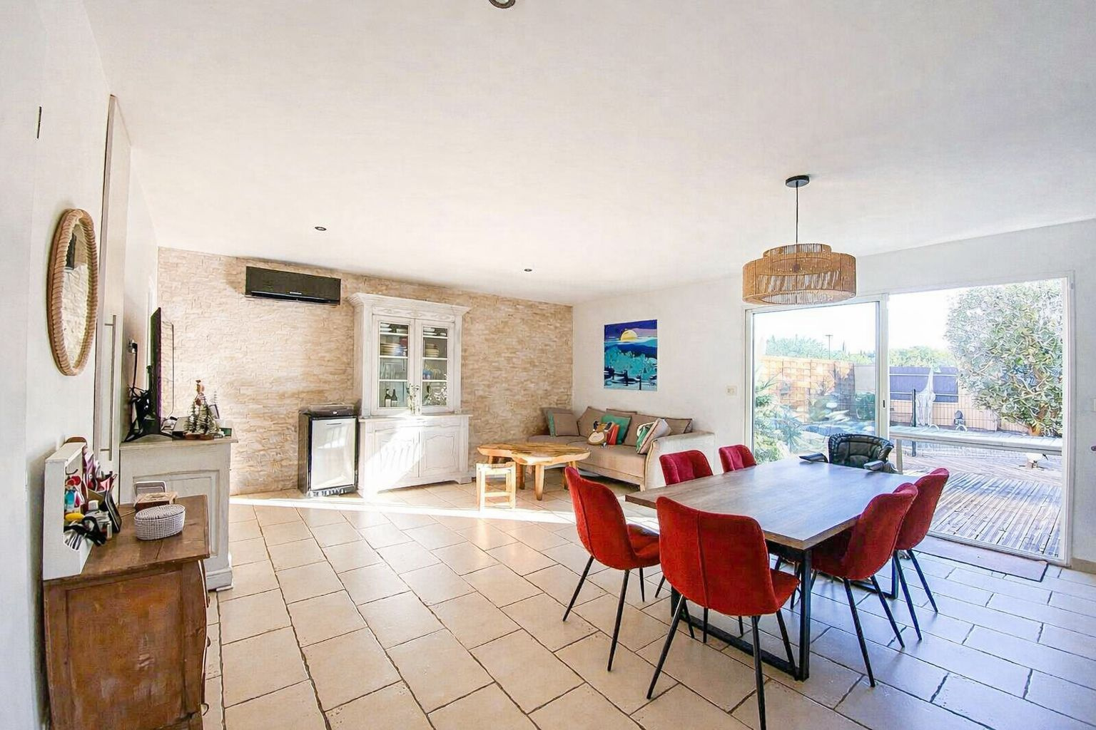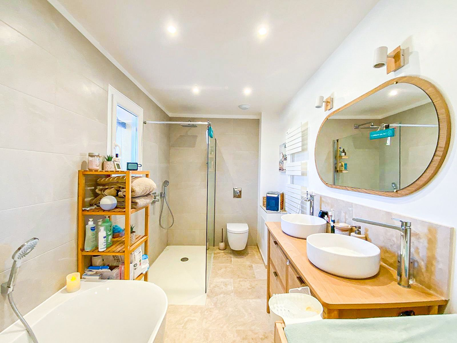Cette villa de 129 m² bénéficie d'une exposition plein sud, offrant une belle luminosité tout au long de la journée. Proche des écoles et commodités, elle constitue un cadre de vie idéal pour une famille. Édifiée sur deux niveaux, la maison propose au rez-de-chaussée un appartement T2 indépendant comprenant séjour, cuisine, chambre, salle d'eau ainsi qu'un garage. À l'étage, un espace de vie composé d'un salon, d'une salle à manger, d'une cuisine équipée, de deux chambres et d'une salle d'eau. À l'extérieur, plusieurs terrasses et un balcon permettent de profiter pleinement du climat méditerranéen. Vue dégagée, potentiel de division et qualité de construction complètent les atouts de cette propriété.