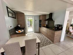 - Une cuisine ouverte avec porte fenêtre donnant sur une terrasse