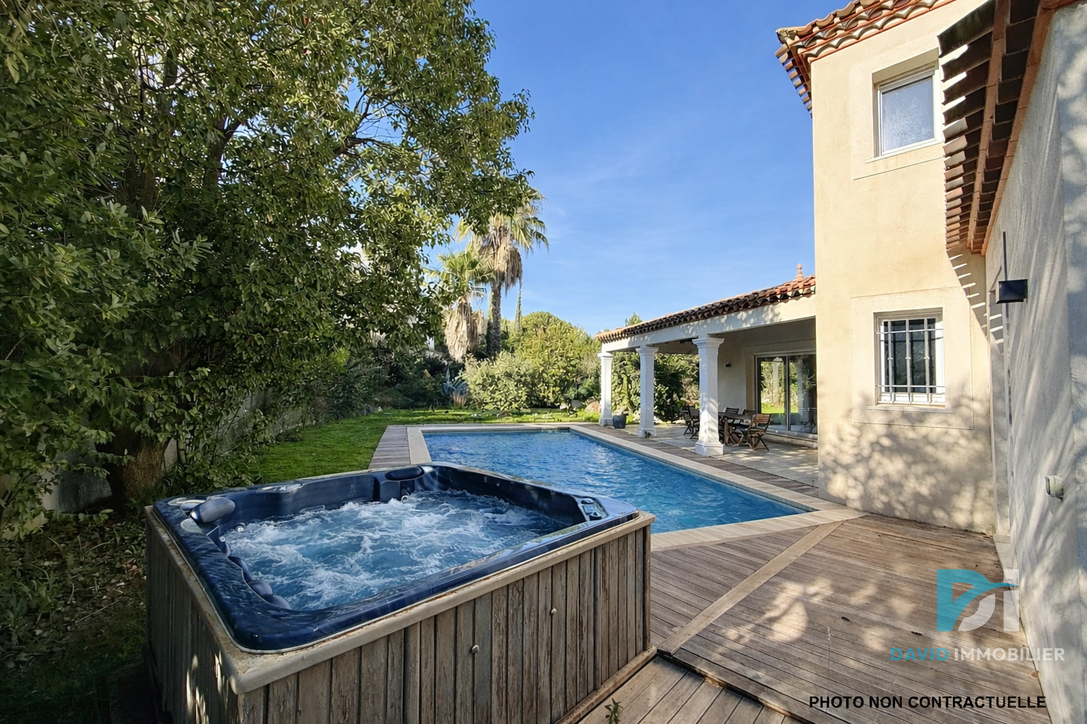 VILLA CONTEMPORAINE DE CONSTRUCTION RÉCENTE 3 FACES 123 M2 3 CHAMBRES DONT 1 AU RDC JARDIN AVEC PISCINE GARAGE BÉZIERS Située dans un quartier résidentiel, le lotissement les Terrasses de Saint Nazaire de Béziers, à seulement 15 minutes des plages, découvrez cette splendide villa contemporaine de 123 m2, construite fin 2024, offrant des prestations modernes et un confort optimal. Une pièce de vie lumineuse et conviviale : Dès l'entrée, vous accédez à une spacieuse pièce de vie de plus de 50 m2, décorée avec goût et réalisée avec des matériaux de qualité. Elle se compose d'une cuisine américaine aménagée et équipée, d'un espace salle à manger et d'un coin salon chaleureux, idéal pour les moments de détente. De grandes baies vitrées apportent une belle luminosité et offrent une vue dégagée sur le jardin et la piscine. Un rez-de-chaussée fonctionnel : Toujours au rez-de-chaussée, la villa dispose d'une suite parentale avec salle d'eau équipée d'une douche à l'italienne et d'un dressing, bénéficiant d'un accès direct à l'extérieur par ses baies vitrées. Des toilettes indépendantes complètent ce niveau, ainsi qu'un garage d'environ 17 m2, accessible directement depuis l'entrée de la maison. Un espace nuit confortable à l'étage : À l'étage, vous découvrirez deux belles chambres avec placards, ainsi qu'une salle d'eau moderne comprenant une double vasque, une douche à l'italienne et des toilettes. Des extérieurs pensés pour le plaisir : L'extérieur offre un agréable espace jardin avec piscine aux pierres de Bali (5 x 2,5 m profondeur 1,50 m), une terrasse avec cuisine d'été, idéale pour les repas en plein air. Les autres faces de la maison permettent l'aménagement d'espaces complémentaires : jeux, potager ou coin détente selon vos envies. Un cadre parfait pour profiter de moments conviviaux en famille ou entre amis. Des prestations modernes et soignées : La villa est équipée d'une climatisation gainable, de volets roulants électriques, d'électroménagers de qualité et de nombreuses prestations supplémentaires faisant de ce bien une maison clé en main. Informations complémentaires : DPE : A GES : A Taxe foncière : 2 200 EUR / an Si vous recherchez une villa récente où il ne vous reste plus qu'à poser vos valises, contactez-moi dès maintenant pour organiser une visite. Contact : Salomé FABRE agissant en sa qualité d'agent commercial inscrit au Registre spécial des Agents commerciaux sous le numéro 897 875 787 R.S.A.C. Béziers. MAIL : fabre-salome@abithea.fr TEL : 06 10 61 43 56
