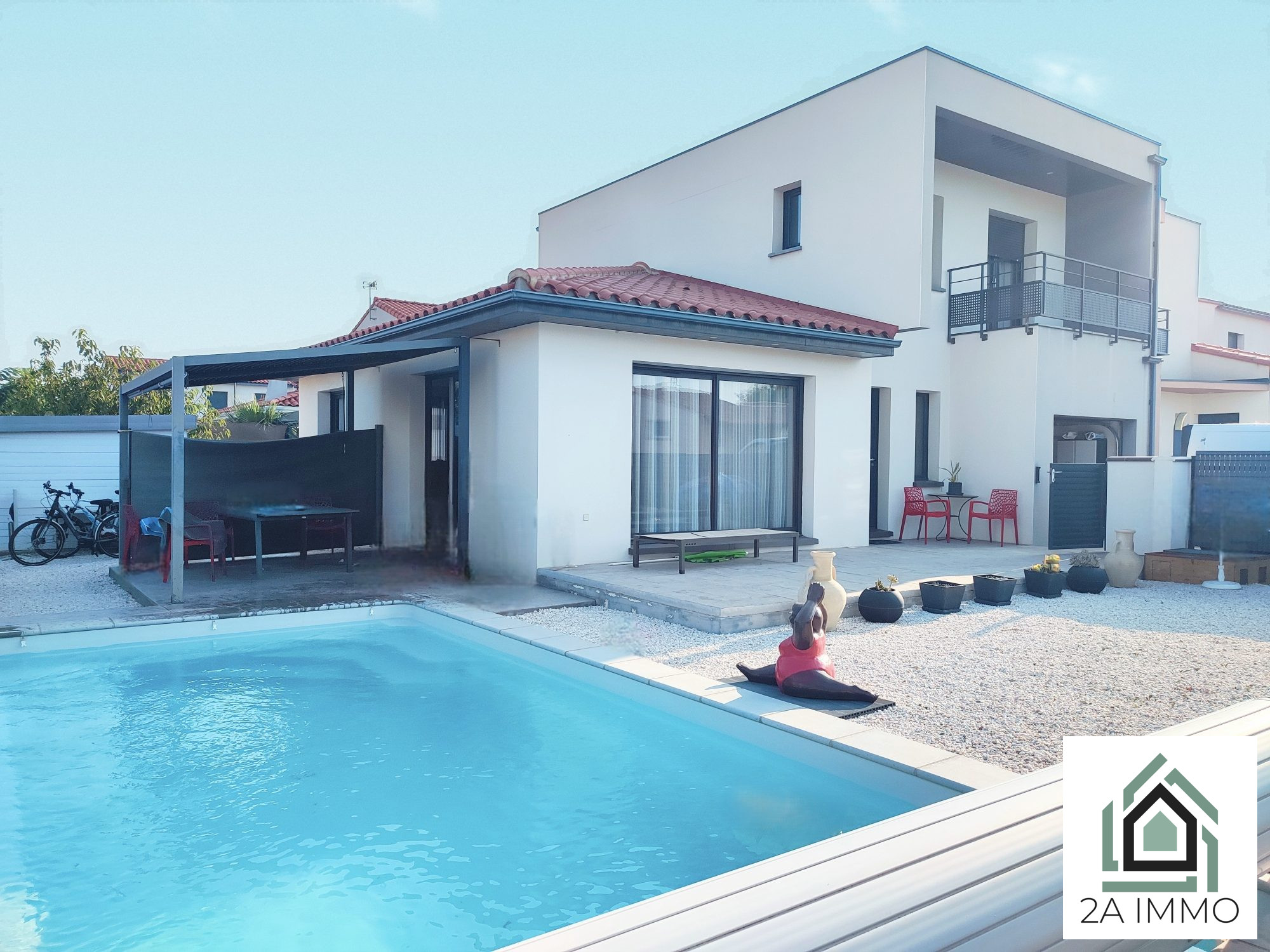 Villa traditionnelle 3 faces - 7 pièces, 180 m2 à découvrir ! nichée dans un quartier résidentiel calme et verdoyant, cette villa traditionnelle de 180 m2 habitables, édifiée sur une parcelle de 465 m2, est un véritable havre de paix à proximité de toutes les commodités. Commerces, écoles, administrations et médecins sont accessibles à pied, offrant ainsi un cadre de vie pratique et agréable. Caractéristiques de la villa Dès votre arrivée, vous serez accueilli par une magnifique allée de jardin menant à un porche fermé, qui vous conduit dans un hall d'entrée spacieux. Le séjour, baigné de lumière, est agrémenté d'une cheminée à foyer fermé, créant une atmosphère chaleureuse. La cuisine artisanale ouverte, équipée d'un îlot central, se distingue par ses plans de travail et crédences en granit noir du Zimbabwe, et offre un accès direct à une terrasse semi-ouverte, idéale pour recevoir vos convives. Profitez des plaisirs de la vie en extérieur avec un barbecue, un emplacement couvert pour jacuzzi, et une piscine chauffée au sel de 8x4 , exposée plein sud. Au rez-de-chaussée, vous trouverez également un cellier, une chambre, une salle d'eau avec WC, ainsi qu'un garage de 20 m2 pour votre confort. À l'étage : Un grand dégagement dessert 4 grandes chambres lumineuses avec dressings dont une suite parentale avec salle d'eau et wc, une magnifique salle de bain équipée d'une baignoire d'angle et d'une toilette indépendante avec lave main. Au dernier étage : Une chambre supplémentaire et un bureau vous offrent des espaces polyvalents, parfaits pour le télétravail ou pour accueillir des invités. Cette propriété est équipée de climatisation réversible, de chauffages électriques, de fenêtres PVC double vitrage, de stores électriques, d'un chauffe-eau thermodynamique, de panneaux solaires d'une puissance de 3 kW, ainsi que d'une isolation dans les combles projetée en laine de roche. Pour votre sécurité, un système d'alarme et des caméras de surveillance sont également installés. Un forage à 16 m complète ce bien, garantissant un approvisionnement en eau pour votre jardin. Cette villa est idéale pour une grande famille ou un investisseur souhaitant profiter d'un cadre de vie agréable et fonctionnel. Ne manquez pas cette opportunité unique ! Contactez-nous dès aujourd'hui pour organiser une visite et laissez-vous séduire par cette villa d'exception.