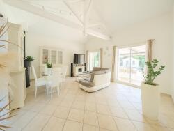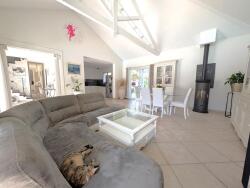 La plafond cathédrale donne du charme à la pièce principale qui se prolonge vers les deux terrasses, invitant à profiter des extérieurs en toute saison.