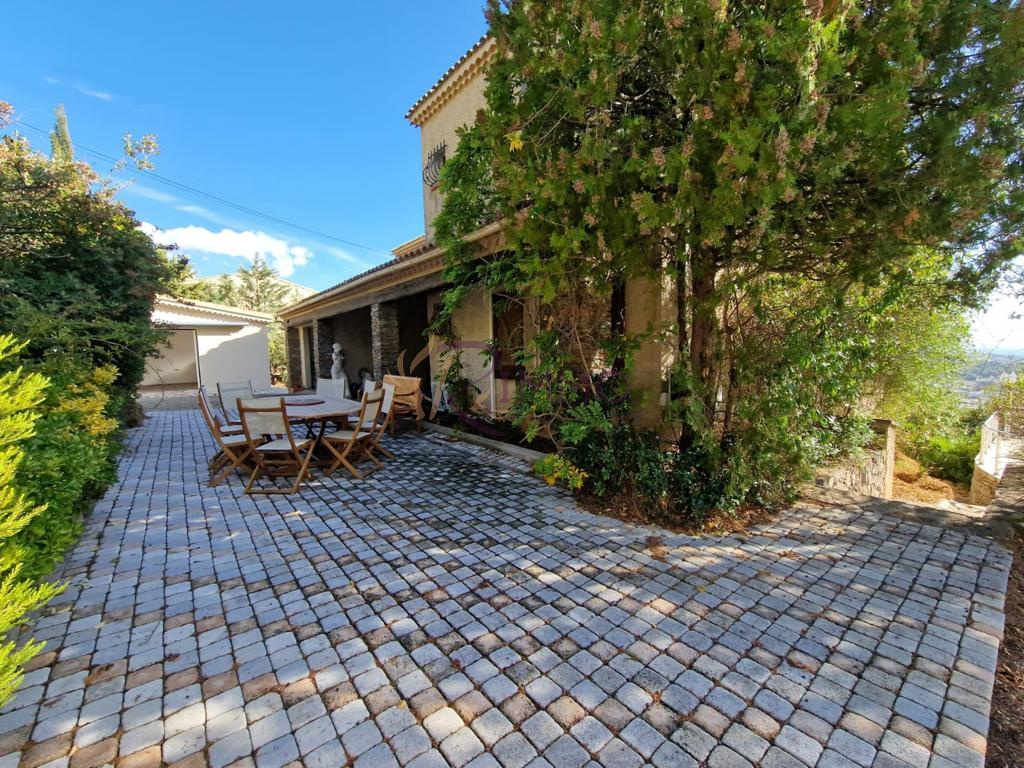 LA VALETTE-DU-VAR : Au calme, dans un cadre campagne avec une belle vue dégagée et mer, jolie villa de 176 m2 habitable + 2 dépendances (38,58 m2 et 2 0m2) à aménager éventuellement pour un studio ou salle de jeux. Ce bien aux beaux volumes se compose de 4 chambres dont 2 sur terrasse sud et 2 bains, bureau donnant sur un solarium plein sud. Un beau salon/séjour (35m2) avec cheminée sur terrasse sud (20m2) et cuisine équipée donnant sur une superbe terrasse sud (42m2). Une buanderie complète cet ensemble pouvant convenir pour une 5e chambre. La maison est équipée de double vitrage, de climatisation réversible dans chaque pièce, de panneaux solaires. Elle est posée sur un terrain arboré de 1981 m2 pouvant accueillir de nombreux véhicules.