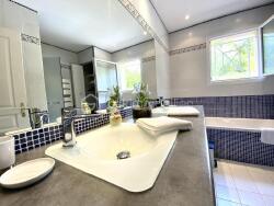 Une salle de bain avec double vasque, baignoire, douche, placard de rangement, ainsi qu'un wc séparé.